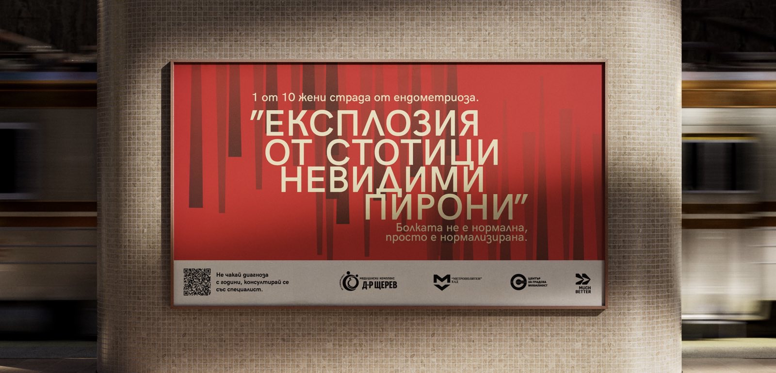 In Bulgarian public transport, dedicated seats exist only for mothers with children and disabled people. There is no place for invisible conditions, which is why, together with Sofia Urban Mobility Center, we created the first seat for women with endometriosis - a visible symbol for an invisible pain. Real quotes from women describing their pain were branded on the public tranpsort stops, making people pause and think. To make the pain tangible, we also created ambient posters entirely built by hand, incorporating wires, nails, and cut vinyl to turn the dismised pain into something impossible to ignore.